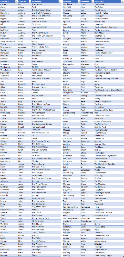 Anstelle der richtigen Namen, stehen in der Begegnungstabelle die (in-)offiziellen Nicknames der Snookerspieler - wie in diesem fiktiven Beispiel: